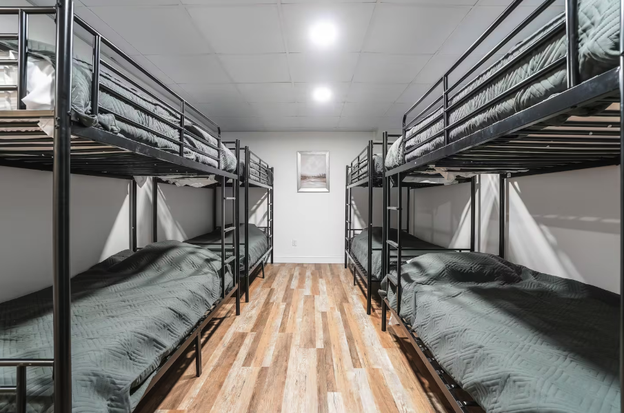 This shared bedroom on the 4th floor offers (5) bunk bed style sleeping arrangements. Each bed offers a top and bottom twin size bed with a private full bathroom. You have the option to choose a top or bottom bunk.
