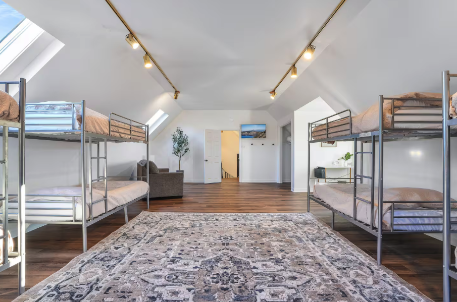 This shared bedroom on the 4th floor offers (4) bunk bed style sleeping arrangements. Each bed offers a top and bottom twin size bed with a shared bathroom. You have the option to choose a top or bottom bunk.
